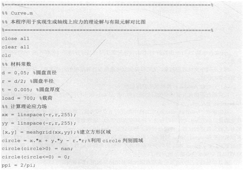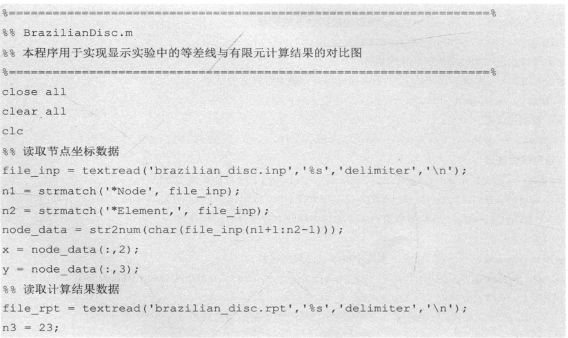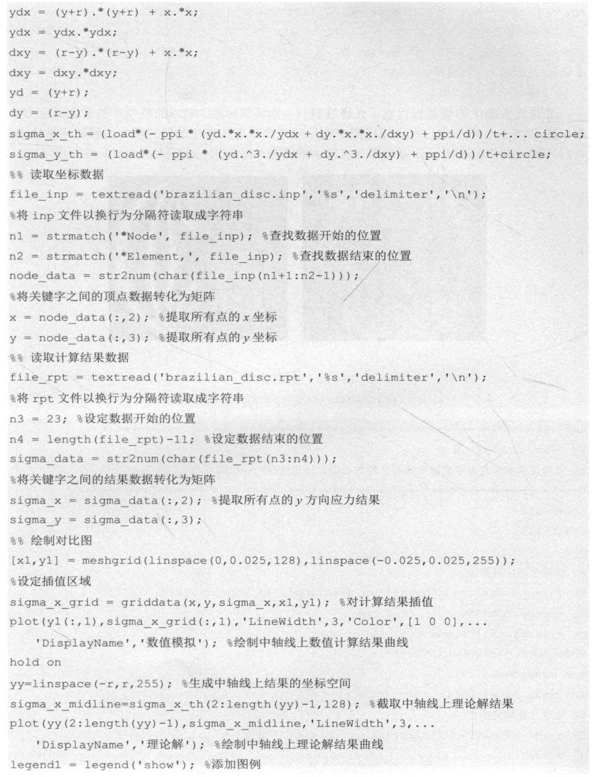 首先读取“brazilian_disc.inp”文件中单元的节点的坐标,将其赋值给变量x和y。需要注意的是,由于.inp文件同时包含了注释等说明信息,读取数据时,需要先通过查找关键字的方式确定数据的位置,再进行读取。然后读取“brazilan_disc.rpt”文件中的结果数据,将其赋值给变量sigma_ data。同样地,需要先确定数据的位置,再进行读取和进一步处理。读取数据后,x,y,sigma_data矩阵中分别存储了节点的坐标和应力,有了这些矩阵,就可以用MATLAB完成本节中描述的问题了。