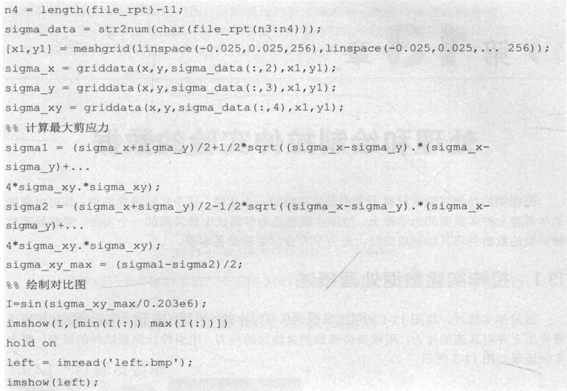 光弹性实验中的等差线代表了光弹性材料(如环氧树脂)制成的模型中的最大剪应力分布,图12-5 (a)所示为与本计算模型中同尺寸光弹模型实验中的等差线。为验证计算结果,可将同样载荷下的有限元计算结果与实验中的等差线绘制在一起,如图12-5 (b)所示。