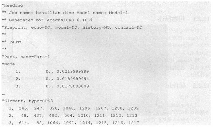 从Abaqus中可以导出两个存储计算数据的文件:.inp和.rpt文件。其中.inp文件中存储了计算模型的几何数据,如节点的坐标和单元的节点信息等;.rpt文件中存储了位移、应力等计算结果信息。Abaqus的计算结果存储在二进制的.odb文件中,用“report”选项可从.odb文件中输出ASCII码的.rpt文件。