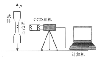光学引伸计(optical extensometer)如图14-2所示。用光学引伸计测量应变时,首先在试件表面制作两个标记点,之后使用数字相机实时采集标记点的数字图像(实时记录的图像序列构成一个视频,因此光学引伸计也称为视频引伸计)。实验结束后,用图像处理的方法精确定位各幅图像中两个标记点的坐标(xA,yA)和(xB,yB),根据不同时刻标记点的坐标可计算出应变。
