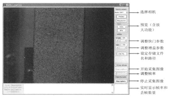前面的例子可以完成图像采集,但在实际应用中还存在一些不方便的地方。事实上,可以按照本书第6章介绍的GUI制作方面的内容,将上述程序改写成界面形式,这样更便于操作。作者编写的一个实验中应用的图像采集程序如图14-16所示。图像具有相机选择、放大预览、快门和增益调整、图像存储及帧率和丢帧数目实时显示等功能。程序文件可在网站上下载。