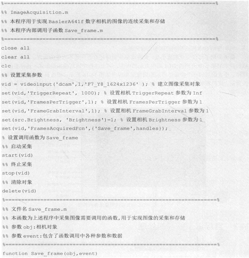 在图像采集之前,先要建立采集对象,并对采集对象进行参数设置。在设置完成后,就可以实现图像采集和处理了。本例中,将图像采集和处理用一个采集调用函数实现。采集对象每成功采集一幅图像,就会调用一次该函数。该函数可按要求生成含时间信息的字符串,并以该字符串为文件名将图像存储。