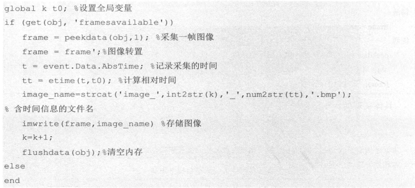 在此函数中,传递了一个参数event,包含了函数调用中各种参数和数据,例如函数调用的时间(即图像采集的时间)。前已述及,测量中必须确知每幅图像的记录时间,以便和其他被测物理量在时间轴上对齐,本例即给出了使用event获知图像采集时间的方法。