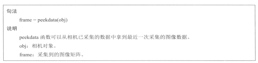 此外,函数中还用到了一个命令—peekdata。该命令可以从相机已采集的数据中拿到最近一次采集的图像数据到workspace中。