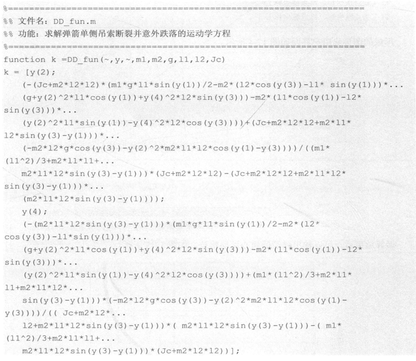 运动学控制方程(17-1)为二阶常微分方程,可通过ode45函数求解。编制自定义函数function k=DD_fun(~,y,~,m1 ,m2,g,11,12,Jc),并存为文件DD_fun.m,以方便GUI主程序调用。代码如下: