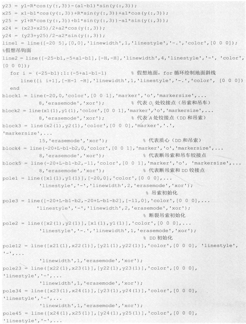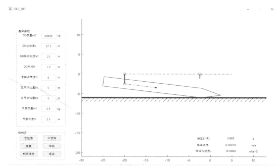 在图形化界面中,为使弹箭的跌落过程更加形象,在画布中绘制弹箭轮廓。首先,应用自定义函数function k=DD_fun(~,y,~,m1,m2,g,11,12,Jc),可求解获得不同时刻弹箭质心的位置参数;然后,利用质心和弹箭轮廓上各点的相对位置关系,绘制某一时刻的弹箭轮廓控制点,将各个轮廓控制点连接,即可形成该时刻吊索和弹箭轮廓。依此法可获得各个时刻吊索和弹箭轮廓的空间位置参数,从而实现吊装跌落过程的动态显示。