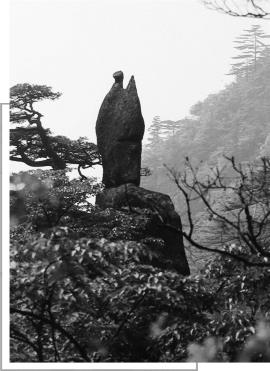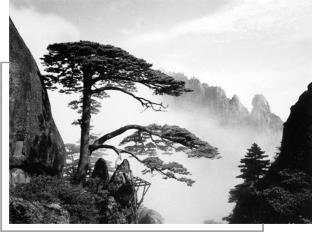 “黄山松”享誉中外,素有“无石不松,无松不奇”的称谓。黄山松多生长在海拔800 米以上的高山崖石上。树龄一般在数百年以上,少数甚至达上千年。这些名松古老苍劲,奇形怪状,有立有卧;有的俯仰斜插,有的刚毅挺拔,有的盘曲倒挂。为此,人们评出了十大名松:舒枝引客的迎客松、垂首送宾的送客松、展翼欲飞的凤凰松,以及连理松、蒲团松、黑虎松、麒麟松、团结松、探海松、飞龙松。不论在山顶、山坡,还是山谷之中,黄山松到处可见,既奇且秀,美不胜收。
