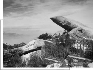 历史同样成全了泰山的松树,虽然不如黄山松树名气大,但是古树自身的帝王之气也非他处可比。6株古树,树身扭结上耸,若虬龙盘曲,虽大部分已肤剥心枯,但仍能继生新枝,苍古葱郁。普照寺内的六朝松,遮天盖地,冠若凤舞,干若龙盘,树龄长达1 500年。傲然屹立在泰山十八盘起始处的望八松,犹如一位巨人,倾身探臂,企盼游人。不过古松最为集中的当属对松山,两峰对峙,万松罗列,因松树层层叠叠,又有十三层松之说。古松有的侧身绝壁,有的屈曲于深壑,有的直刺云天,有的横空欲飞,山风吹起,松涛大作,山鸣谷应,有如巨浪拍岸。