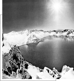 在白头山顶部的火山口,由于积水而形成了面积为9.8平方千米的天池。天池处于中朝两国边境上,整个湖面呈椭圆形,像一块碧蓝的大宝石镶嵌在群峰之中。天池南北长4.8千米,东西宽3.3千米,周长为13.1千米,平均水深204米,最深处为373米,是我国最深的湖泊,其海拔为2194米,也是我国火山口湖海拔最高的一个。平时,湖中波光粼粼,清澈碧透,湖周岩壁陡峭,险峰林立,构成一幅赏心悦目的风景画卷。雨雾时,浪花翻卷,水天相连,茫茫沧海,云海翻卷如絮,美不胜收。天池风光瑰丽,水力资源丰富。其蓄水量为20亿立方米,是松花江、鸭绿江、图们江三江的水源。“三江”源远流长,千秋万代滋润着东北大地,造福于民。