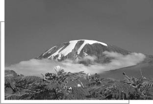 乞力马扎罗山有两个主峰,一个叫基博,另一个叫马文济。两峰之间由一个10多千米长的马鞍形的山脊相连。远远望去,乞力马扎罗山是一座孤单耸立的高山,在辽阔的东非大草原上拔地而起,高耸入云,气势磅礴。雄伟的蓝灰色的山体同其白雪皑皑的山顶一起,赫然耸立于坦桑尼亚北部的半荒漠地区,如同一位威武雄壮的勇士守卫着非洲这块美丽富饶的大陆。