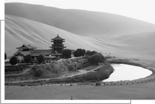 流沙与泉水之间仅数十米,但虽遇烈风而泉却不被流沙所湮没,地处戈壁而泉水则不浊不涸。历来水火不能相容,沙漠、清泉难以共存。但是月牙泉就像一弯新月落在黄沙之中。泉水清凉澄明,味美甘甜,在沙山的怀抱中娴静地躺了几千年,虽常常受到狂风凶沙的袭击,却依然碧波荡漾,水声潺潺。它的神奇之处就是流沙永远填埋不住清泉。月牙泉,梦一般的谜,在茫茫大漠中有此一泉,在黑风黄沙中有此一水,在满目荒凉中有此一景,深得天地之韵律,造化之神奇,令人神醉情驰。