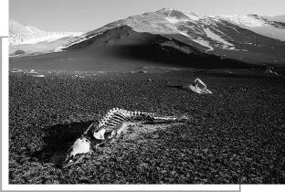 如同沙漠中的绿洲,在常年被冰雪覆盖的南极洲大陆上也有类似的风景存在。冰雪覆盖的白色山岭之间,突然出现了不同的颜色,不再是一片纯白色。穿过南极大陆东北部的麦克默多湾,可以看见一个无雪干谷地区。无雪干谷的西侧是横断山脉,维多利亚谷、赖特谷、地拉谷依次向北排列着。这些干谷的地貌陡峭,从高空望去,呈现大大的“U”字形,土地的颜色以褐色和黑色为主,大量的岩石充斥其间。这些地带在阳光的照射下异常干燥,既无冰雪,也很少降水,更没有郁郁葱葱的树木花草,有的只是裸露的岩石和枯干的动物尸体,偶尔可以找到寥若晨星的紧贴在岩石上面的苔藓、地衣等低等植物,数量极少。死亡、静寂的气氛笼罩着山谷,感受不到一丝鲜活的气息。虽然如此,这些没有被冰雪遮蔽、能见天日的地面,在广阔的南极大陆上极其珍贵,它们特殊的自然环境和气候引起科学家们的兴趣,吸引了一批批科学家前来勘测研究。