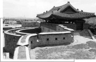 当朝鲜李氏王朝的皇帝崇周于18世纪迁都水原后,他依照当时颇具影响的军用建筑条例在四周修建了防御工程。