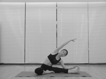 (4)吸气,右臂继续上抬,举过头顶,尝试右臂在右侧侧腰的延长线上(倘若做不到,就到自己合适且舒适的位置),头部在脊柱的延长线上,右肩远离右耳;