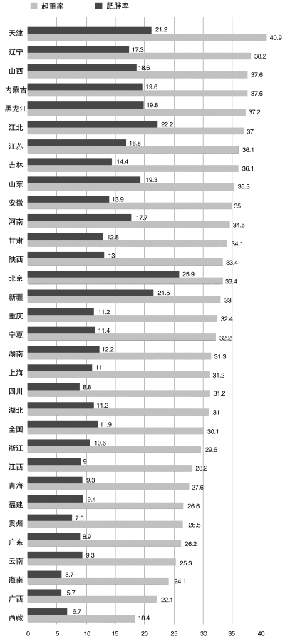 图9-1 2017年疾控中心公布的各省区超重和肥胖率