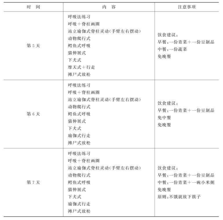 (5)瑜伽练习建议:一般在傍晚6:00~8:00练习,轻断食期间尽量减少脑力劳动和体力劳动,要继续保持瑜伽练习,不可中断,练习时长不超过一个半小时,同时不能进行球类等激烈运动。