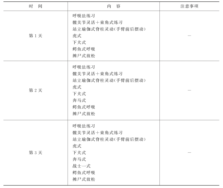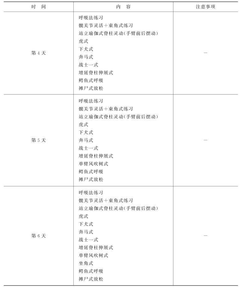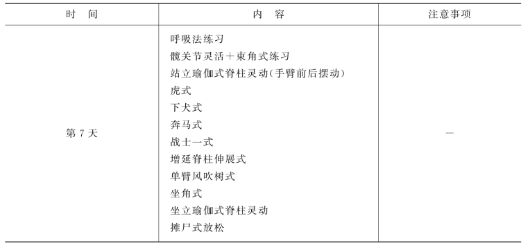 (5)瑜伽练习建议:一般在傍晚6:00~8:00练习,不可中断,练习时长不超过一个半小时,同时不能进行球类等激烈运动。