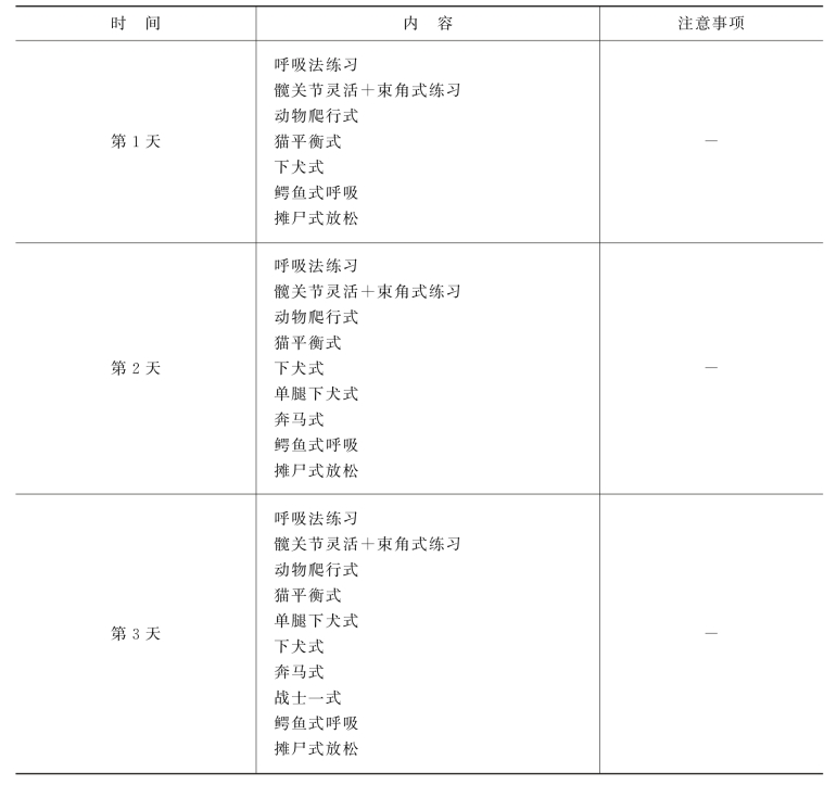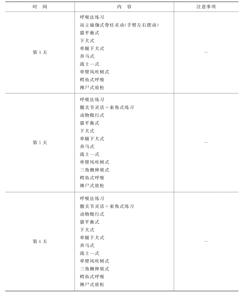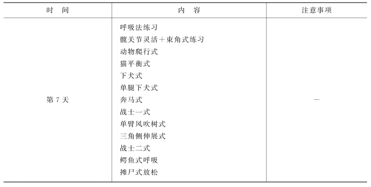 (5)瑜伽练习建议:一般在傍晚6:00~8:00练习,不可中断,练习时长不超过一个半小时,同时不能进行球类等激烈运动。