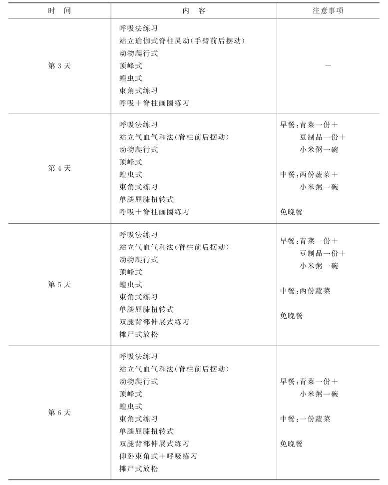 (2)饮食建议:调理期间,以清淡的饮食为主,远离高盐、高热量、刺激性的饮食,第1天、第2天、第3天、第4天采取渐进性减食,第5天、第6天采用轻断食。