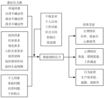 压力反应是指在压力来源的持续作用下,个体产生能被主观意识到的、身心方面反应的过程。Beehr和Newman(1978)在总结了以往的工作压力有关研究成果后得出结论。不良的工作压力产生三个方面的个人消极后果,它们是: