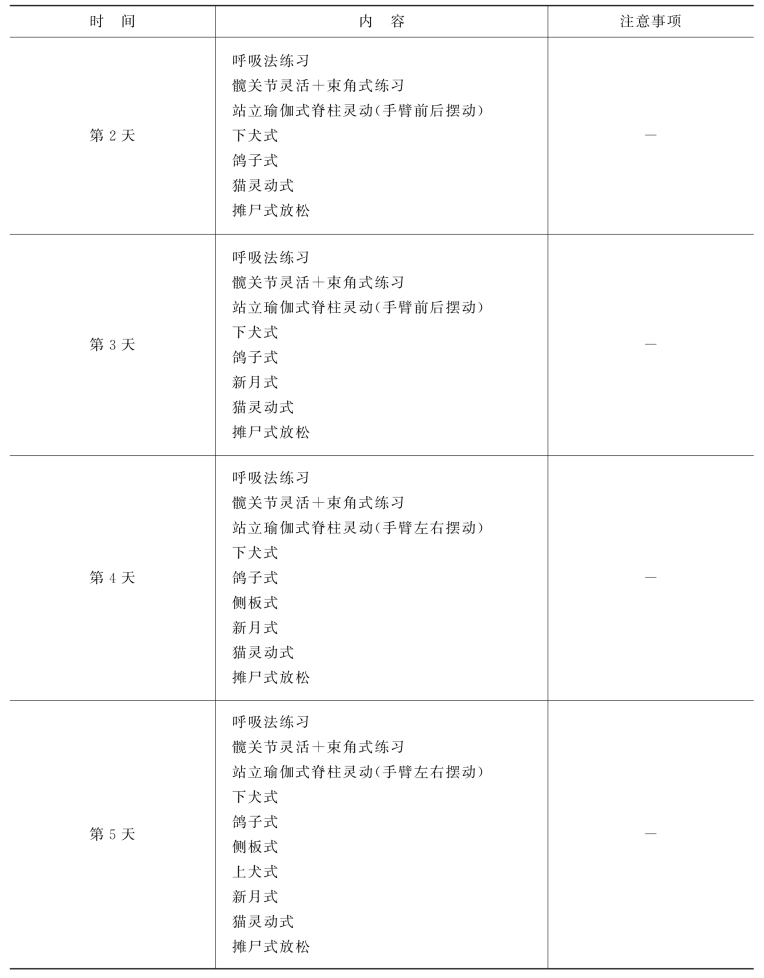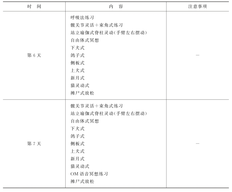 (5)瑜伽练习建议:一般在傍晚6:00~8:00练习,不可中断,练习时长不超过一个半小时,同时不能进行球类等激烈运动。