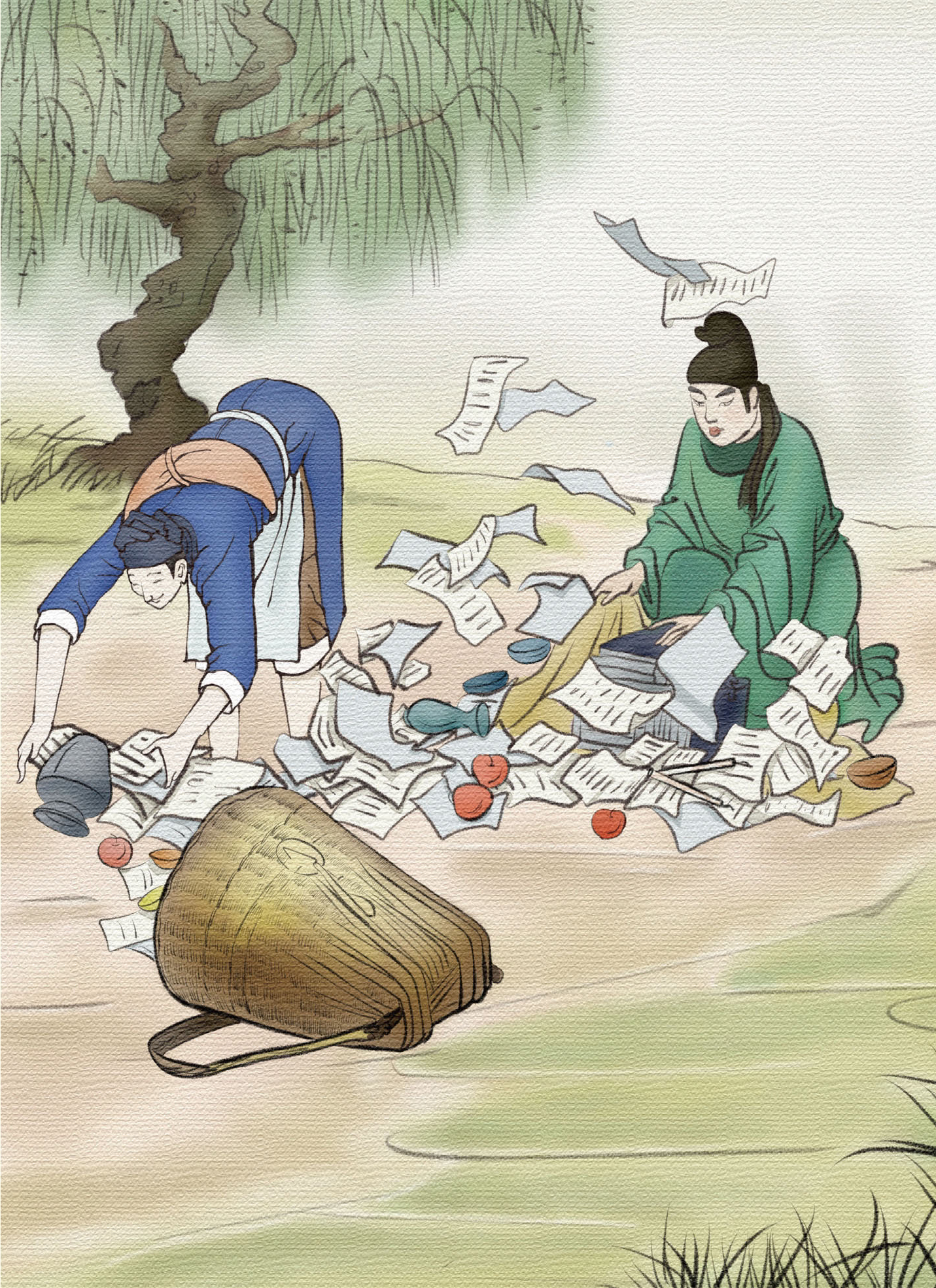 宋应星向老板讲述了自己找这本书的经过。老板被他锲而不舍的求知精神打动了,赶忙找人从水池中散乱的湿纸堆里找齐了那后半部书。