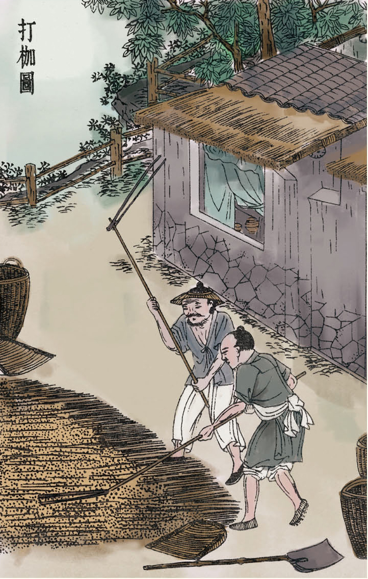 稻子收割之后,就要进行脱粒,也就是要使稻谷从稻秆上脱落下来。脱粒的方法中,用手握稻秆摔打来脱粒的约占一半,把稻子铺在晒场上,用牲口拉石磙进行脱粒的也占一半。
