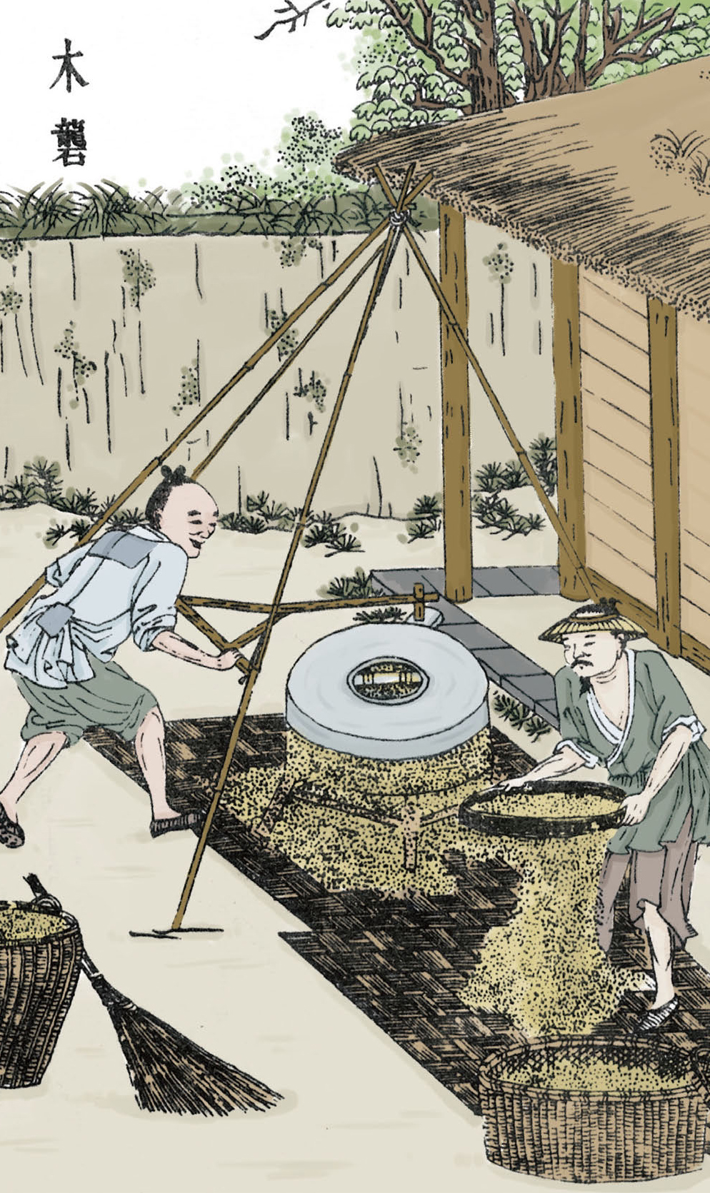 稻谷用砻磨过以后,要用风车吹去糠秕,然后放到石臼(jiù)里舂,臼也有两种。大臼能容30公斤稻谷,小臼的容量约为大臼的一半。舂过以后糠皮都变成了粉,叫作细糠,可以用来喂猪狗。细糠被风车吹净后,留下的就是加工出来的大米了。