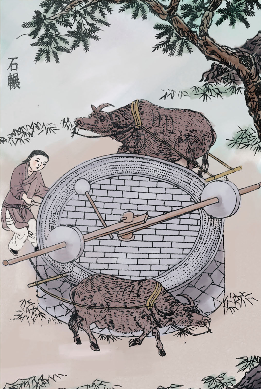 一头壮牛一天能磨120公斤麦子,一头驴一天只能磨60公斤,强壮的人一天只能磨10多公斤。如果用水磨的话,效率比牛拉磨要高出三倍。