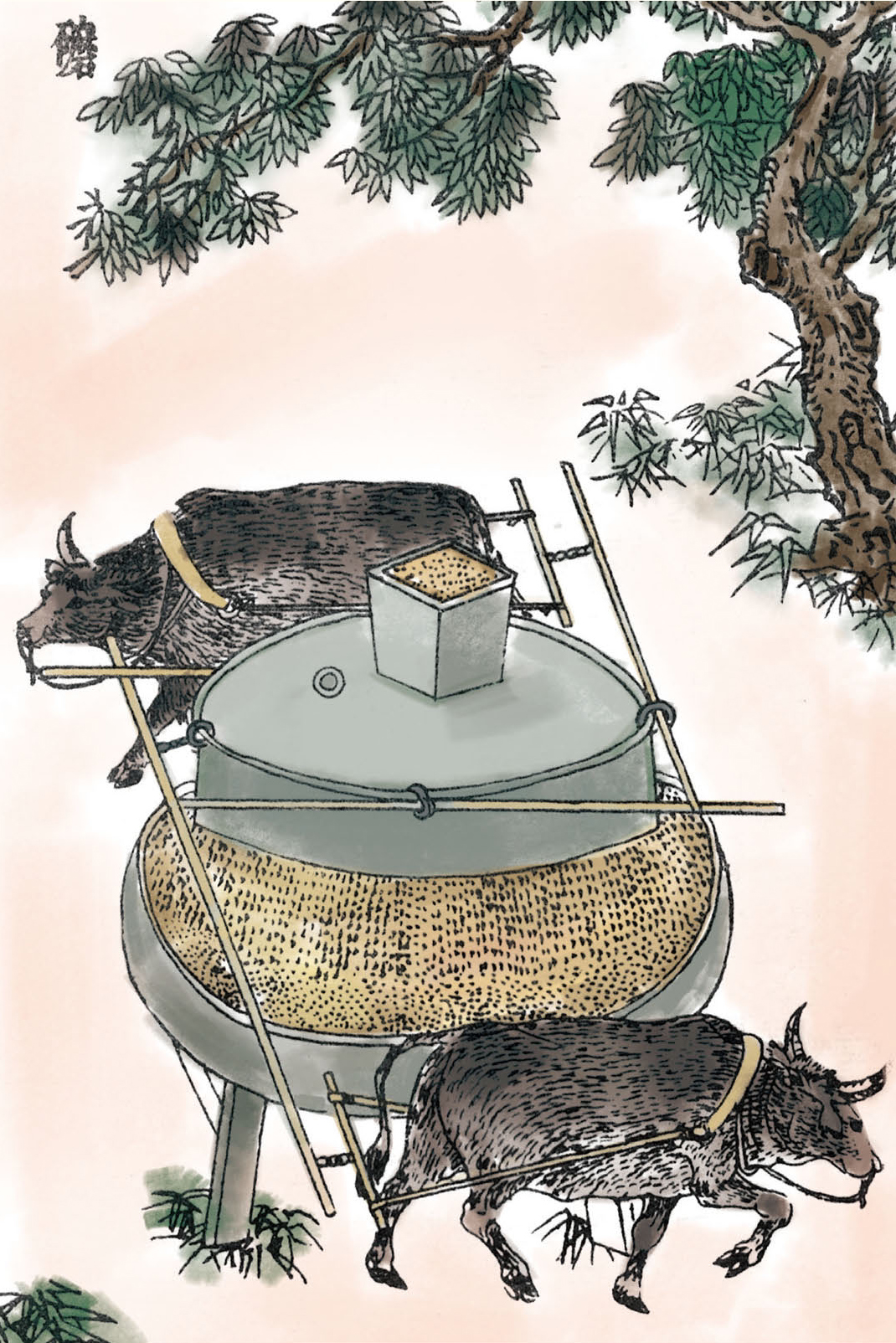 磨的大小没有一定的规格,大的磨要用肥壮有力的牛来拉。牛拉磨时要用桐壳遮住牛的眼睛,否则牛就会转晕。牛的身上要系上一只桶用来盛装牛的排泄物,否则就会把面弄脏了。小一点的磨用驴来拉,重量相对较轻些。再小一点的磨则只需人来推。