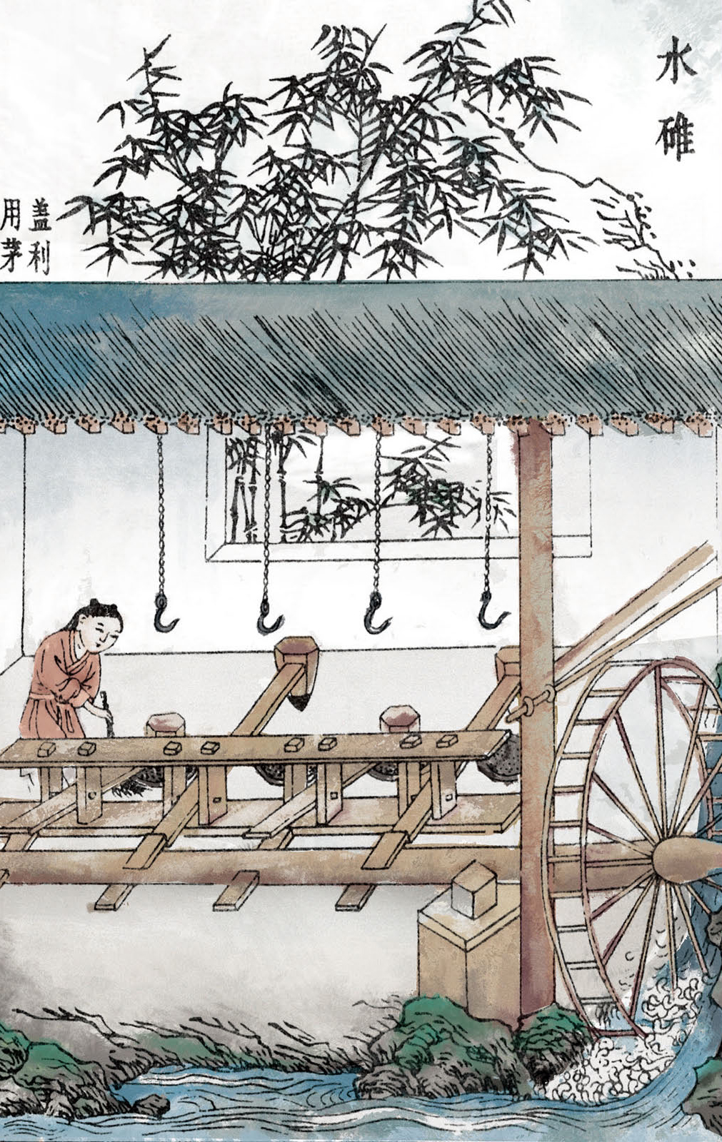 水碓(duì)是山区住在河边的人创造的。用它来加工稻谷,要比人工省力九成,如果用水碓来舂,同时还能起到砻的作用,因此人们都乐意使用水碓。利用水力带动水碓和利用筒车浇水灌田是同样的方法。设臼的多少没有一定的限制,如果流水量小而地方狭窄,就设置两三个臼。如果流水量大而地方又宽敞,那么并排设置10个臼也不成问题。