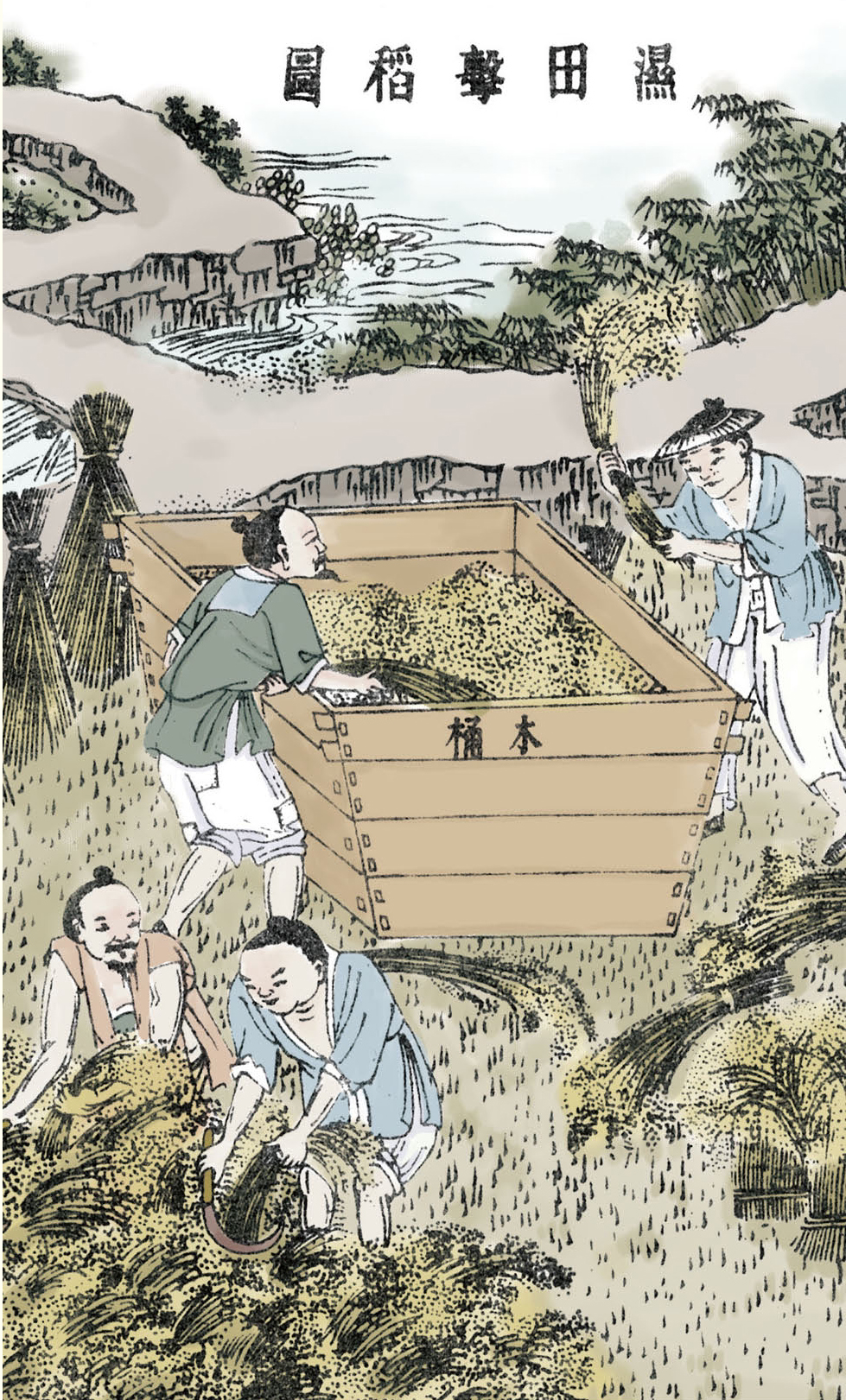 稻子收获时节,如果遇上多雨少晴的天气,稻田和稻谷都很潮湿,不能把稻子运到晒场上去脱粒时,就用木桶在田间就地脱粒。如果遇上晴天稻子也很干,使用石板脱粒也很方便。