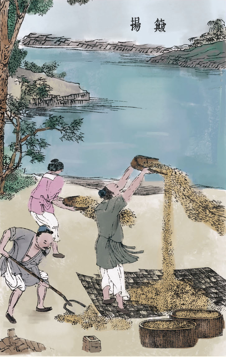 即便是最好的稻谷,其中也会有不饱满、不能吃的秕(bǐ)谷。去掉秕谷的方法,南方都用风车吹去。北方多用扬的方法,总的来说不如用风车方便。