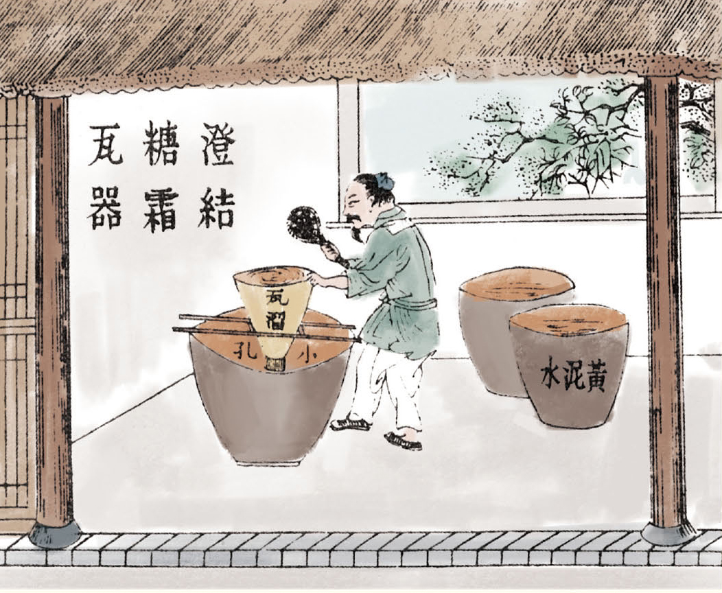 糖匠明确意识到黄泥具有脱色的功效,于是改进泥盖法,演变为添加黄泥浆,这便是黄泥脱色法发展的第二阶段,也就是宋应星在《天工开物》中所记载的工艺: