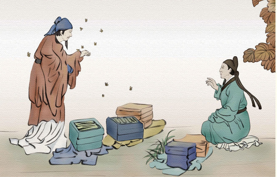 家养的蜜蜂从东邻分群到西舍时,一定会分一个蜂王的后代去当新的蜂王。乡下养蜂的人常常用喷洒甜酒的酒糟来招引蜜蜂进行分房,届时群蜂将组成扇形阵势簇拥护卫新的蜂王飞到新的居处。