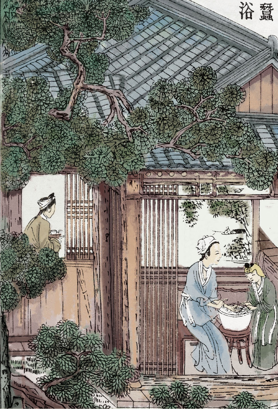 蚕浴指的是对蚕种进行浴种处理,蚕种用浴洗方法处理的,只有嘉兴、湖州两地。湖州多用天然露水、石灰浴蚕,嘉兴则多用盐卤水浴。每张粘有蚕卵的纸,用盐卤水2升,掺水倒入盆中,让纸浮在水面上。每逢腊月十二开始浸浴,至二十四日止,共12天,捞起蚕纸沥干水,用微火烘干,然后珍藏至盒中,不要受潮,待清明时孵化。