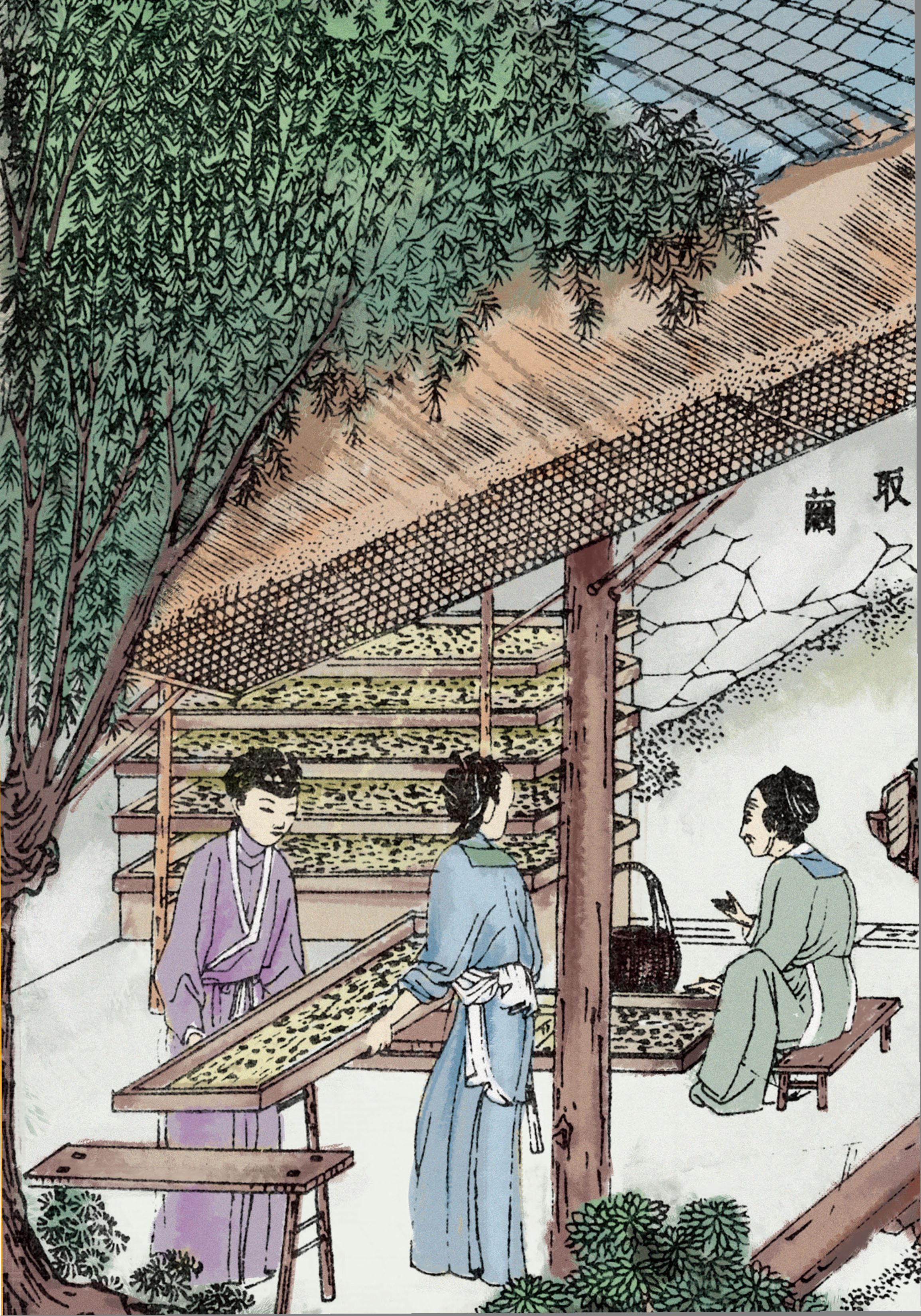 当茧衣结成之后,再用炭火加热,蚕吐出的丝随即干燥,这样处理过的丝使用很久都不易坏。