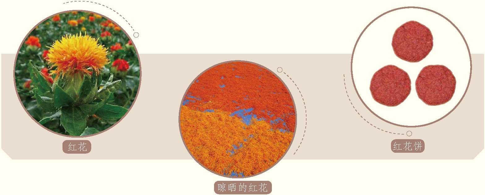 作为药用的红花不必制成花饼。如果是要用来制染料的,则必须按照一定的方法制成花饼后再用,除尽其黄色的汁液,真正的红色就显出来了。红花的籽实煎煮后可以榨出油,刷在贴有银箔的扇面上,在火上烘干后,马上就会变成金黄色。