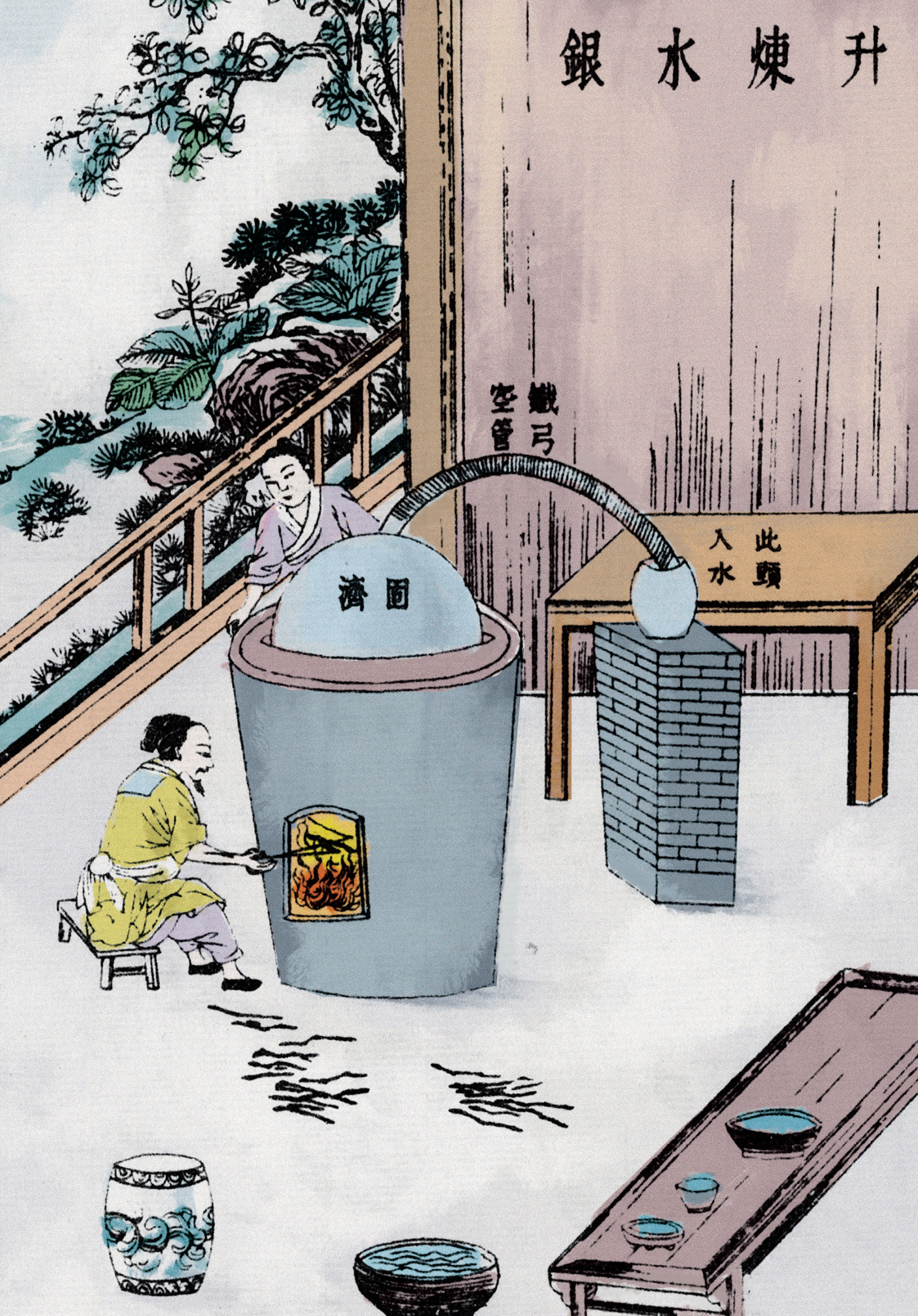 用次等朱砂或二朱作为原料,加水搓成粗条,盘起来放进锅里。每锅共装15公斤,下面烧火用的炭也要15公斤。锅上面还要倒扣另一口锅,顶部留一个小孔,两锅的衔接处要用盐泥加固密封。锅顶上的小孔和一段弯曲的铁管相连接,铁管通身要用麻绳缠绕紧密,并涂抹盐泥加固密封,使每个接口处不能有丝毫漏气。曲管的另一端则通到装有冷水的罐子中,锅中产生的蒸汽冲到罐中,遇到冷水而凝成水银。起火加热煅烧约10小时后,朱砂就会全部化为水银布满整个锅壁。冷却一天之后,再收集凝结的水银。