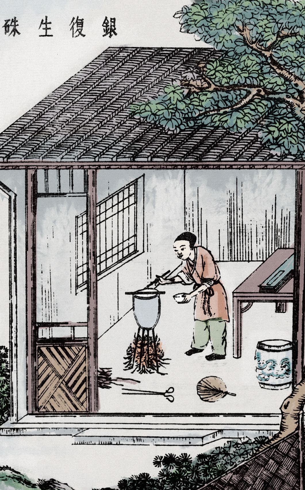把水银再炼成朱砂,就叫作银朱。制作时用一个开口的泥罐子或者用上下两口锅。每斤水银加入天然硫黄2斤一起研磨,要磨到看不见水银的亮斑为止,并炒成青黑色,装进罐子里。罐子口要用铁盏盖好,盏上压一根铁尺,并用铁线兜底把罐子和铁盏绑紧,然后用盐泥封口,再用三根铁棒插在地上鼎足而立,用以承托泥罐。