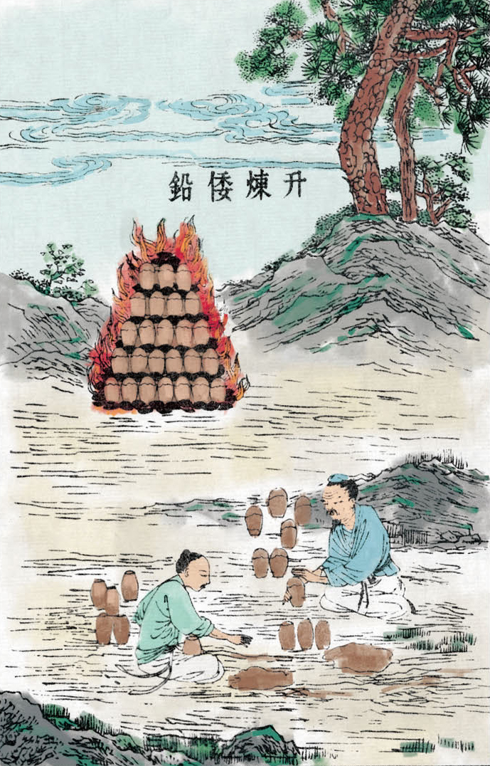 熔炼的方法是:每次将10斤炉甘石装进一个泥罐里,在泥罐外面涂上泥封固,再将表面碾光滑,让它渐渐风干。千万不要用火烤,以防泥罐开裂。然后用煤饼一层层地把装炉甘石的泥罐垫起来,在下面铺柴,引火烧红,泥罐里的炉甘石就能熔成一团了。等到泥罐冷却以后,将罐子打烂后取出来的就是锌。