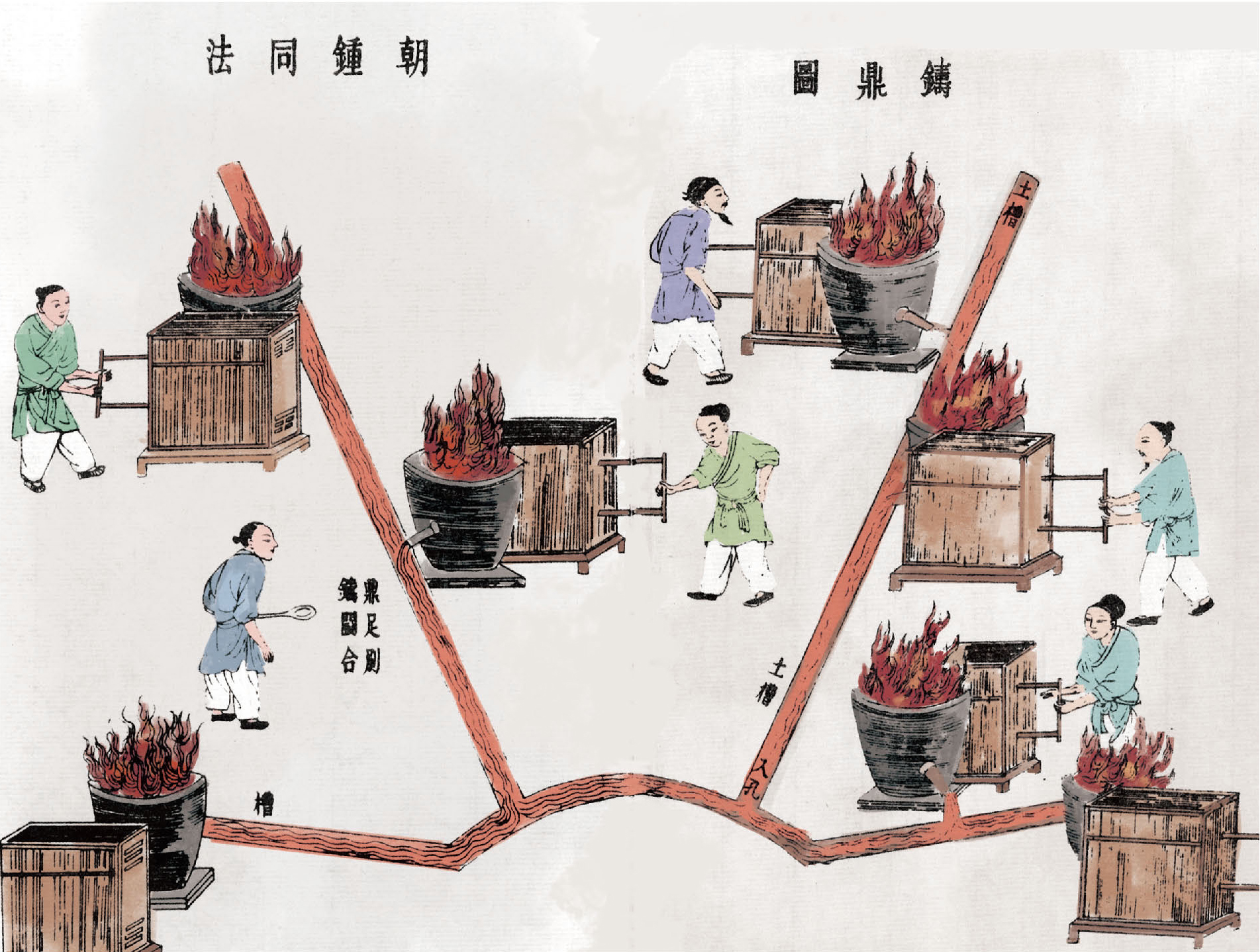 一般来说,每1斤油蜡空出的空腔需10斤铜来填充。要熔化的铜如果达到万斤以上,就要在钟模的四周修筑几个熔炉和泥槽,槽的上端与炉的出口连接,下端倾斜接到模子的浇口上,槽的两旁要用炭火围起来。当所有熔炉的铜都已经熔化时,就一齐打开出口的塞子(事先用泥土当成塞子塞住),铜溶液就会像水流那样沿着泥槽注入模内。这样,钟或鼎便铸成功了。