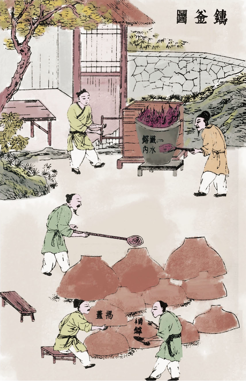 锅(釜)用来储水、加热食物,日常生活中不可或缺。铸造锅的原料是生铁或者废铸铁器。铸锅的模子分为内、外两层。先塑造内模,等它干燥以后,锅的尺寸计算好,再塑造外模。这种铸模要求尺寸非常精确,稍有偏差,模子就作废了。