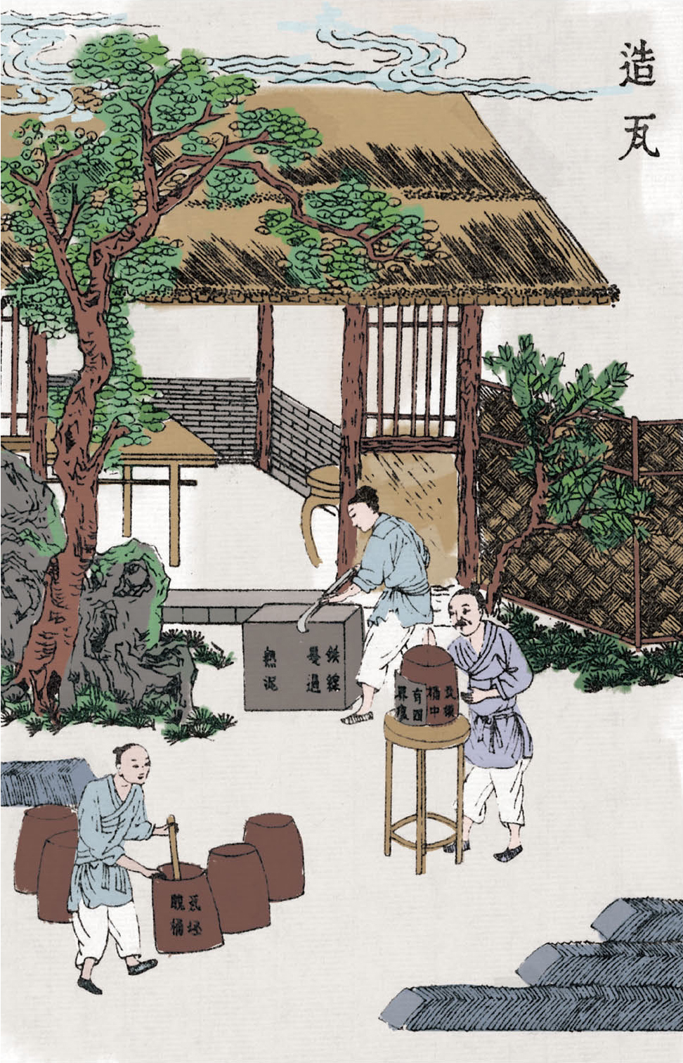 制造瓦片用的泥料要选择不含沙子的黏土。民房所用的瓦是四片合在一起成型的。先用圆桶做一个模型,圆桶外壁画出四条界线,黏土调和好之后,用脚踩成熟泥,堆成一定厚度的长方形泥墩。然后用一个铁线弦弓在泥墩上割出一片1厘米厚的陶泥,像揭纸张那样把它揭起来,将这块泥片紧包在圆桶模型的外壁上。等它稍干一些以后,将模子脱离出来,就会自然裂成四片瓦坯了。