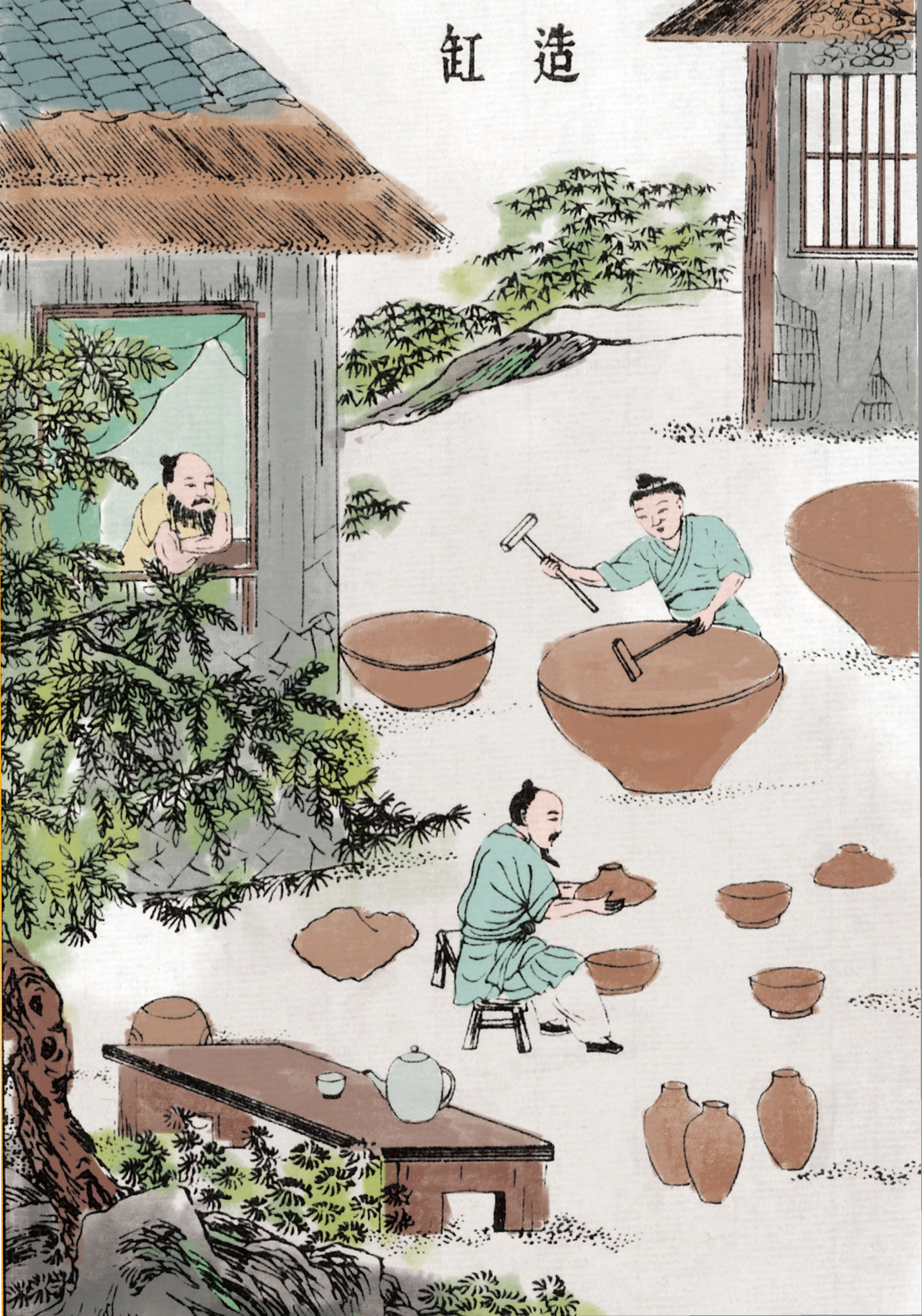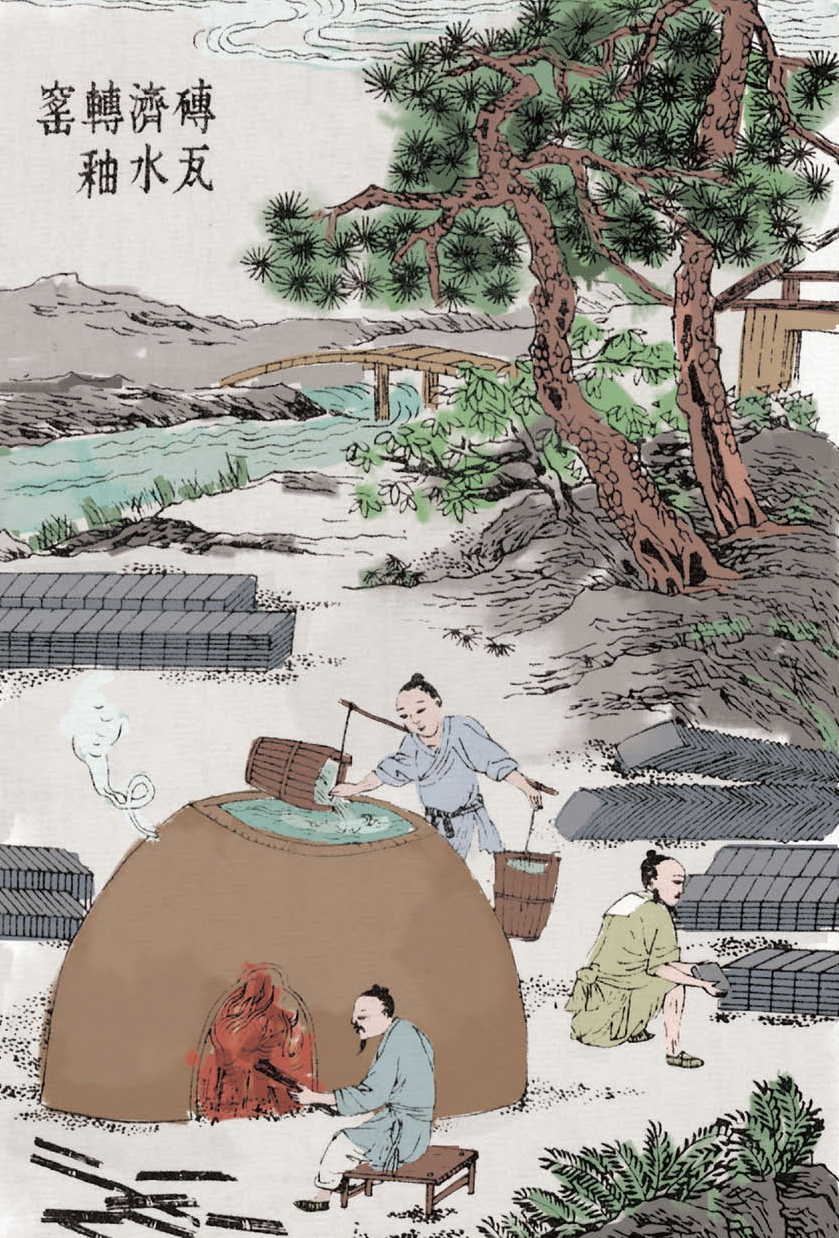 使砖变成青灰色的方法,是在窑顶砌一个平台,平台四周应该稍高一点,在上面灌水。每烧3000斤砖瓦要灌水40担。窑顶的水从窑壁的土层渗透下来,与窑内的火相互作用。借助水火的配合作用,就可以形成坚实耐用的砖块了。