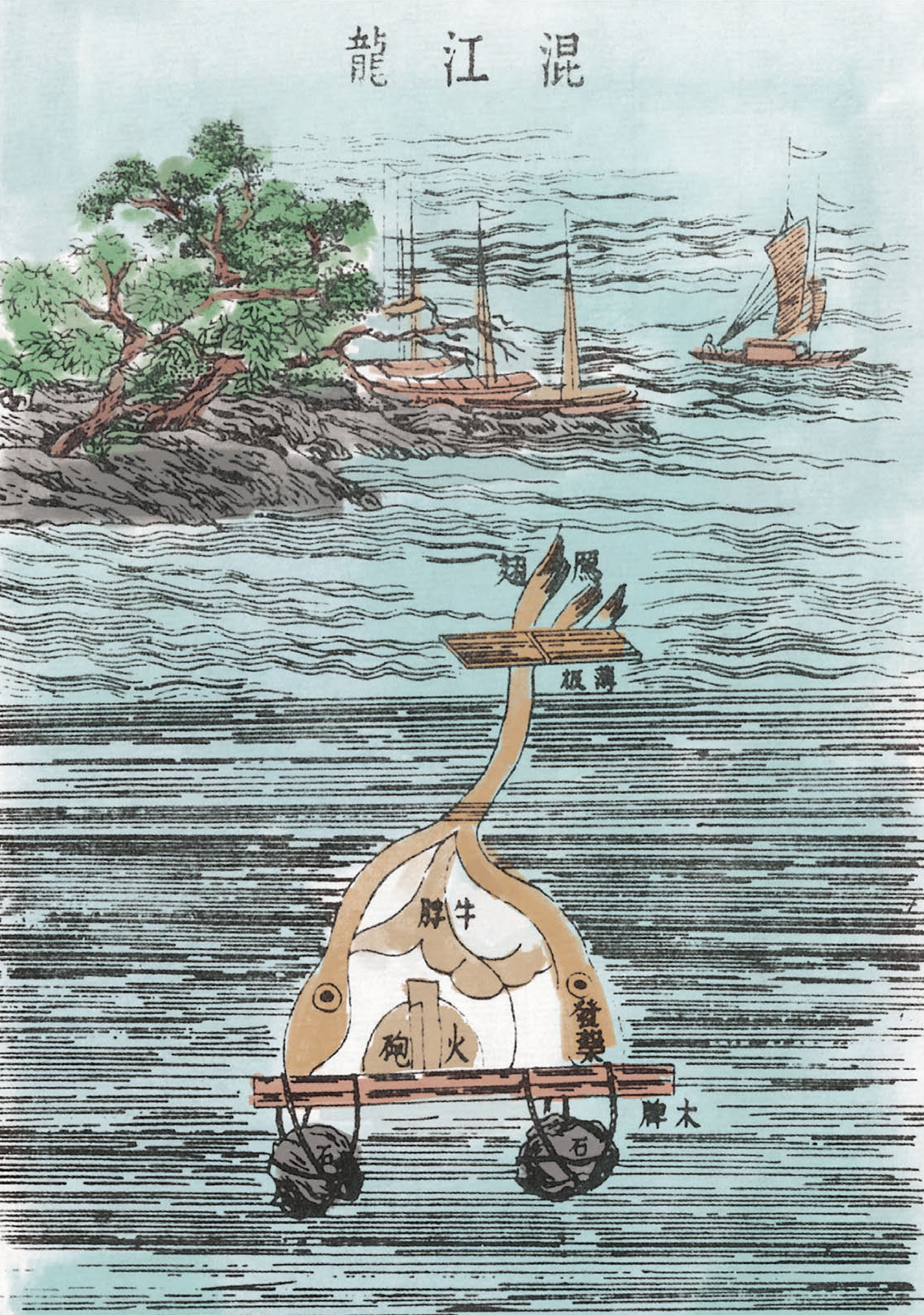 混江龙 一种水雷,用皮囊包裹火药,再用漆密封,然后沉入水底,岸上用一条引索控制。皮囊里挂有火石和火镰,一旦牵动引索,皮囊里自然就会点火引爆。敌船如果碰到它就会被炸毁。