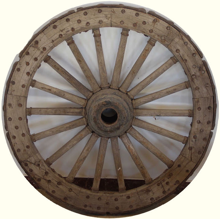 车轮又叫辕,是由轴承(毂,gǔ)、辐条、内缘(辐)与轮圈(辋,wǎng)四个部分组成的。车轮中心装轴的圆木叫毂(俗称车脑),周长约50厘米,是中穿车轴、外接辐条的部件。辐条共有30根,它的内端连接毂,外端连接轮的内缘—辐,紧顶住辋,也是圆形的。辋外边就是整个轮的最外周,叫轮辕。