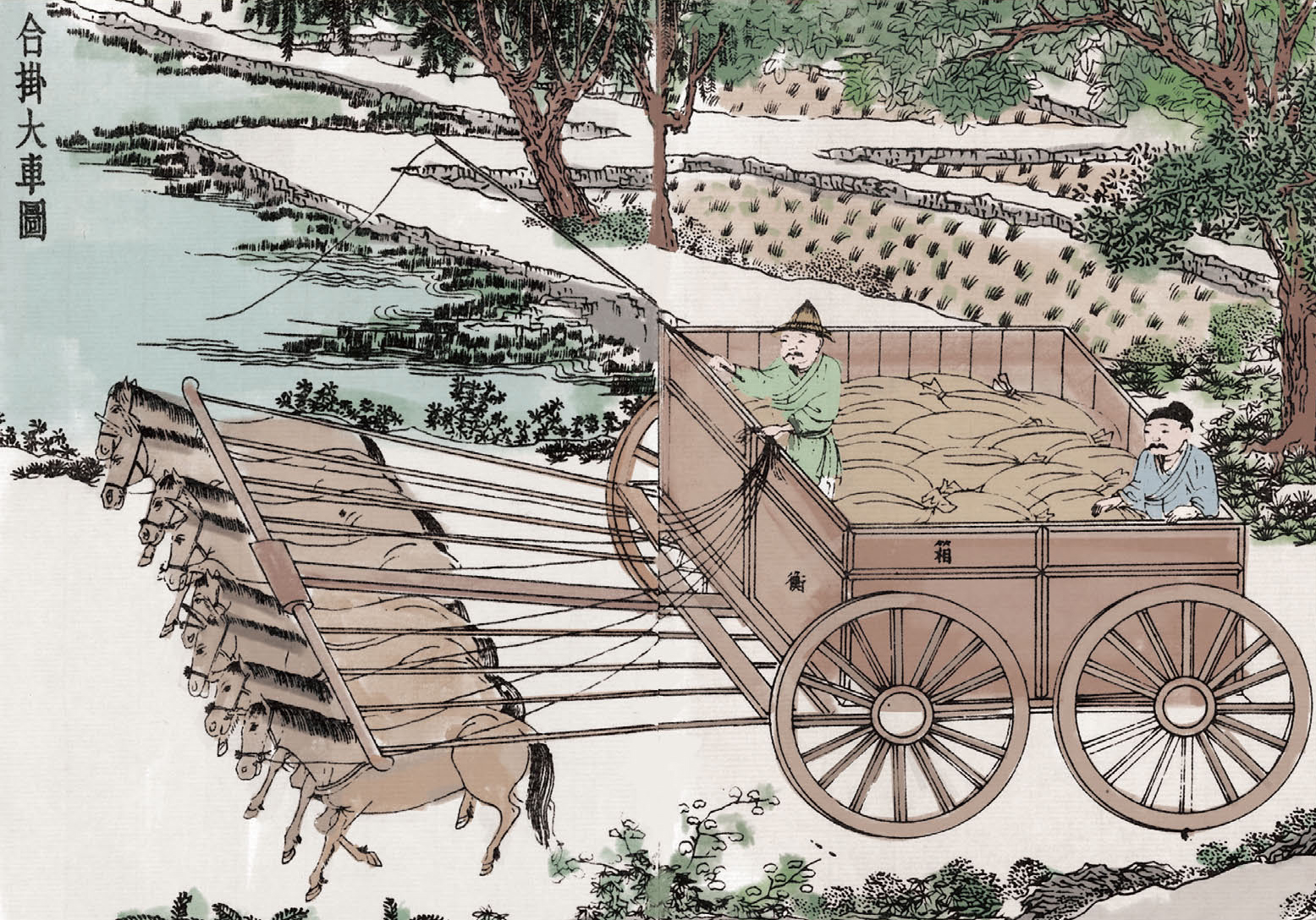 造车的木料,要选用长的做车轴,短的做毂,以槐木、枣木、檀木和榆木(用榔榆)为上等材料。但是黄檀木摩擦久了会发热,因而不太适宜做这些东西,有些细心的人就选用两手才能合抱的枣木或者槐木来做,那当然是再好不过了。轸、衡、车厢及轭等其他部件,则是用什么木都可以。此外,山西盛行用牛车运载粮草,到了路窄的地方,就在牛颈上系个大铃铛,名曰“报君知”,正如一般骡马车的牲口也都系铃铛一样。