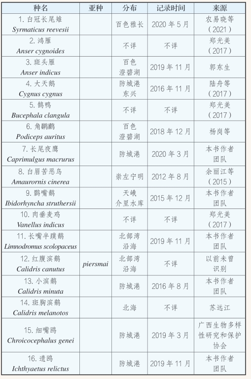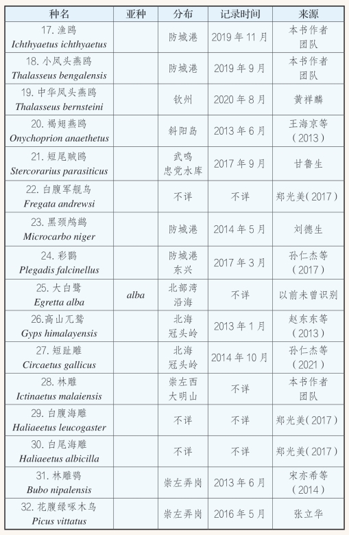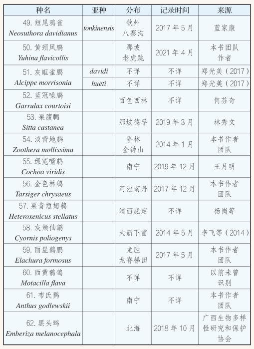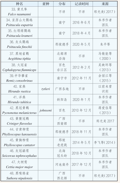 注:由于分类地位变动,广西原有亚种分布记录、现视为独立种的鸟类未列入表中。有亚种名的为新增亚种记录。已经发表的记录则以发表文献为准。