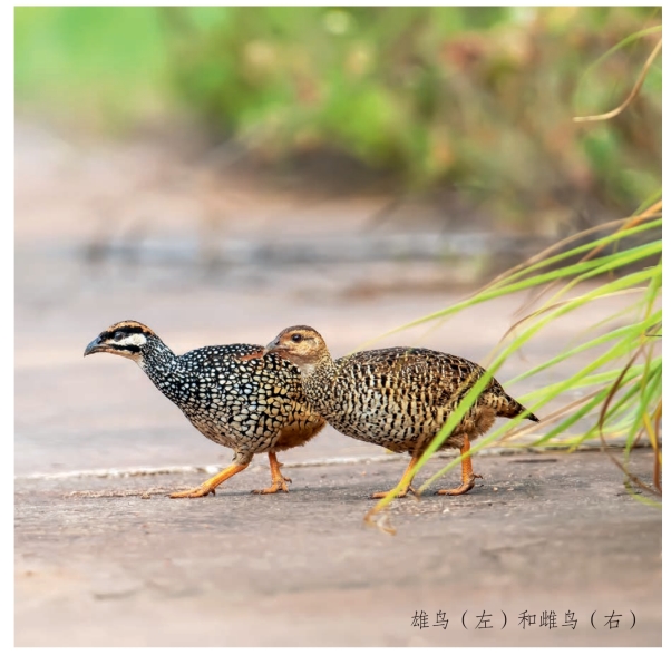 鉴别特征:体长约30 cm,体形中等的鹑类。全身偏褐色,颏、喉和颊部白色,雄鸟身上具明显的白色斑点,雌鸟多黑色横斑。